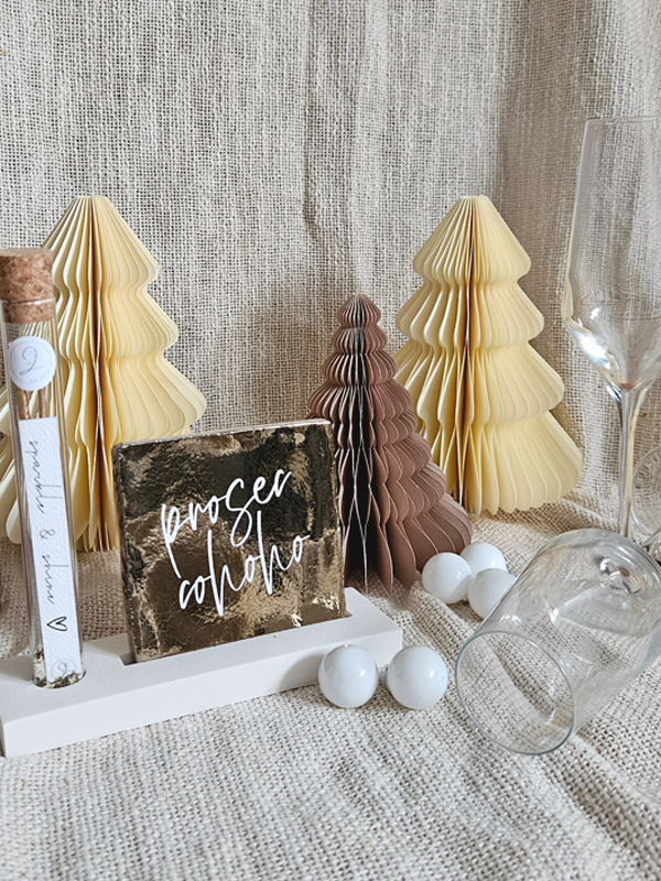 Bringe Glanz und ein Augenzwinkern in die Festtage mit dieser goldfarbenen Fliese (10x10 cm). Die verspielte Aufschrift proseccohoho in weißer Schrift sorgt garantiert für ein Lächeln. In Kombination mit einem Gläschen aus unserer Just4You-Kollektion und dem schlichten Fliesenhalter aus Stoneware entsteht ein einzigartiges Weihnachtsgeschenk.