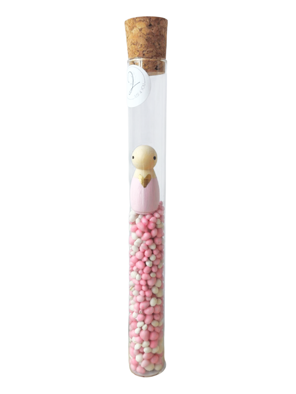 Dieses Glasröhrchen ist ein liebevolles Detail für jedes Just4You Geschenk. Die rosafarbenen Deko-Süßigkeiten und die kleine Pegdoll passen wunderbar zu Anlässen wie der Geburt eines Mädchens. Besonders schön in Kombination mit der passenden Forex-Karte Hallo kleines Wunder.