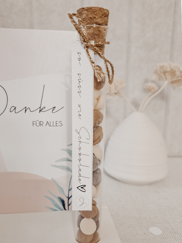 Glasröhrchen gefüllt mit einer köstlichen Mischung aus Vollmilch-, Zartbitter- und weißer Schokolade.
