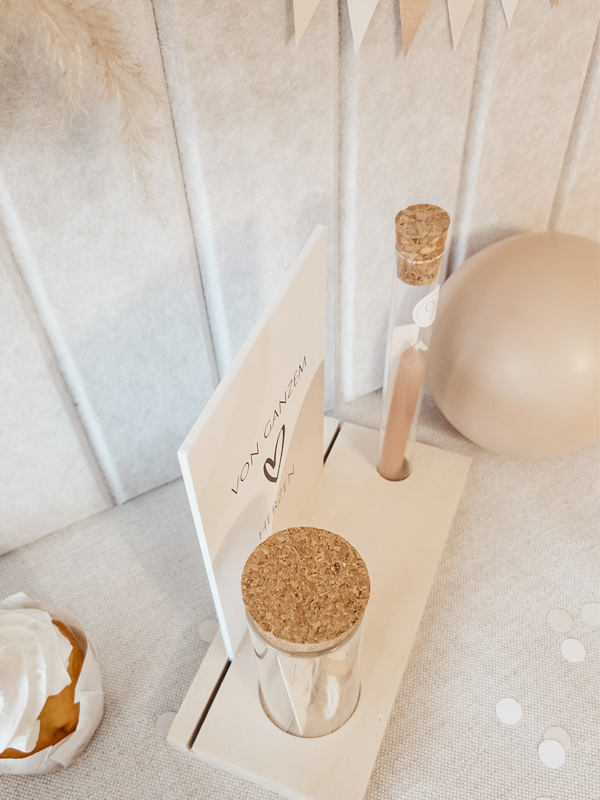 Dieses Glasröhrchen enthält eine Wunschkerze und ist in den Farben Grün, Rosa oder Schwarz erhältlich. Ein kleines, bedeutungsvolles Detail für besondere Momente.