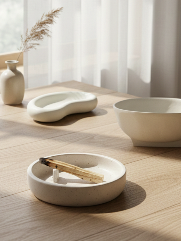 Palo Santo ist bekannt für seine reinigende und beruhigende Wirkung. In Kombination mit dieser Schale entsteht ein Moment der Entspannung, der perfekt zu einer Einrichtung mit natürlichen Materialien und sanften Tönen passt. Die organische Form verleiht dem Ganzen einen verspielten, aber harmonischen Charakter, während der Japandi-Stil für eine gelassene, minimalistische Ausstrahlung sorgt.